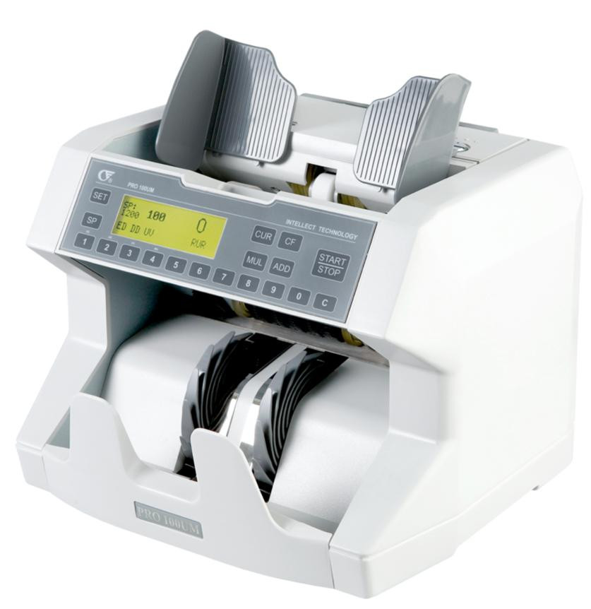Пересчет различных видов валют. Проверка по размеру и оптической плотности. Ультрафиолетовая детекция. (PRO 100 U, PRO 100 UM). Магнитная детекция на RUR, USD, EUR. (PRO 100 UM). Варьируемый размер фасовки. Счет с накоплением итога.