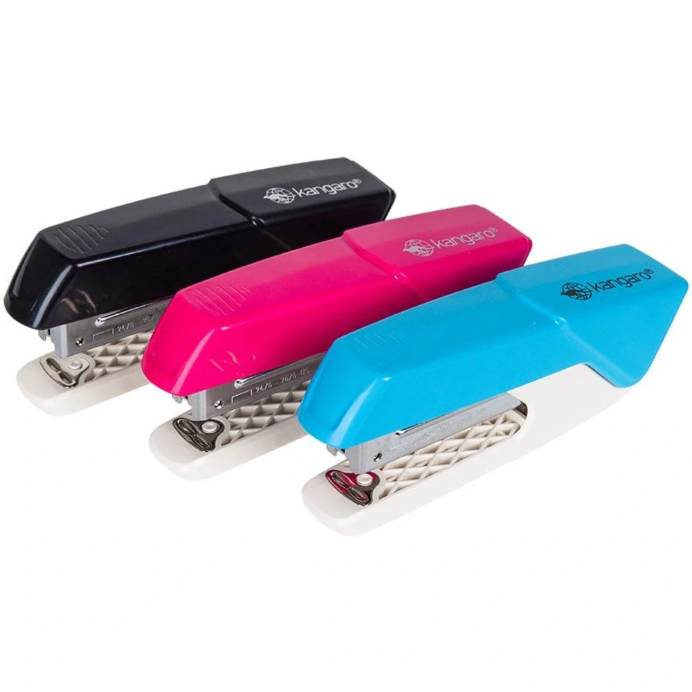 Скобосшиватель Kangaro Aris 35 выполнен в пластиковом корпусе с металлическими элементами. Скобосшиватель сшивает до 20 листов. Глубина захвата скобосшивателя 50 мм. Магазин вмещает до 50 скоб 24/6, до 100 скоб 26/6. Скобосшиватель оснащен скоборасшивателем.